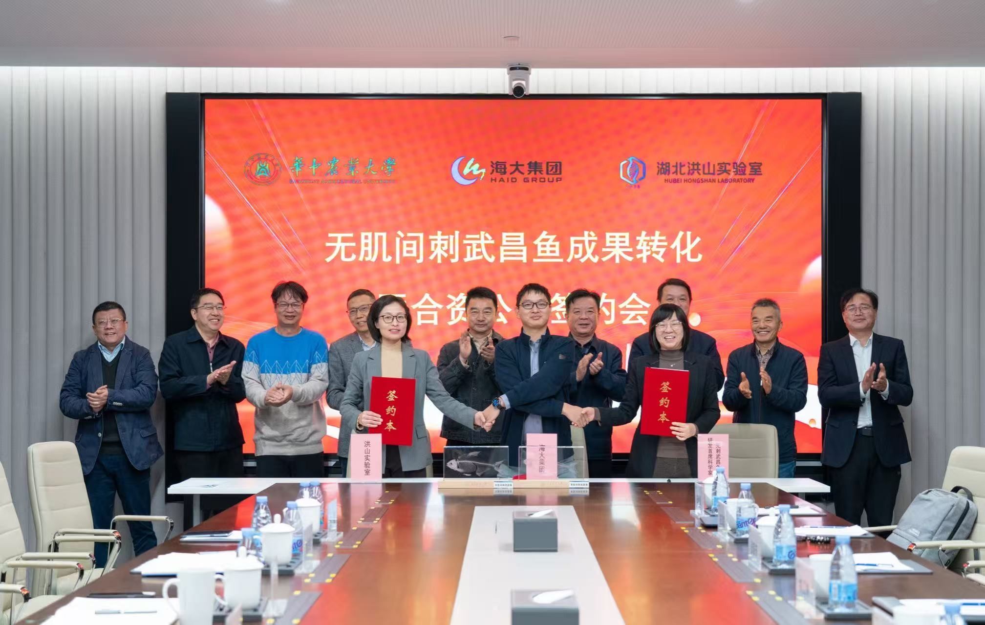 在广东海大集团股份有限公司,开展了座谈交流,并举行了无肌间刺武昌鱼成果转化暨合资公司签约仪式。广东海大集团股份有限公司董事长、总裁薛华介绍了海大集团近年来的发展和与学校、实验室开展合作情况,希望能进一步加强科技、人才合作。