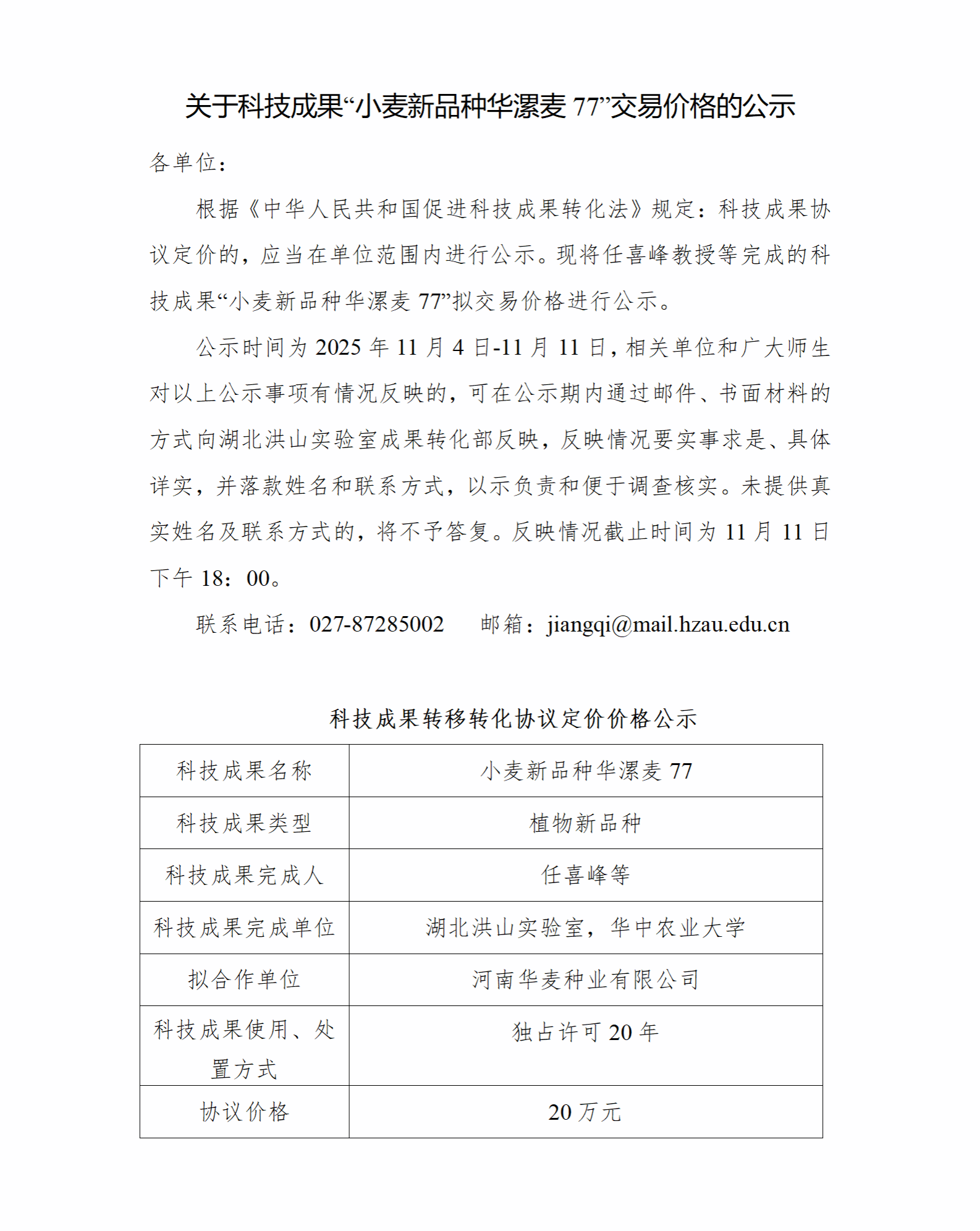关于科技成果“小麦新品种华漯麦77”交易价格的公示